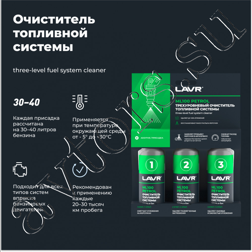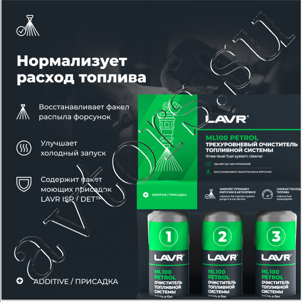 Трехуровневый очиститель бензиновой топливной системы Лавр LAVR ML100 присадка в бензин 3×120 мл. Заменяет промывку форсунок в автосервисе и удаляет до 100% отложений Восстанавливает факел распыла форсунок и снижает расход топлива Очищающий комплекс LAVR ISP/DET™ Разработан на основе средства для промывки систем впрыска ML101 EURO Удаляет отложения в каналах и на поверхности форсунок Увеличивает срок службы элементов топливной системы Безопасен для катализатора и кислородных датчиков Каждый состав рассчитан на 30 – 40 литров бензина Подходит для всех типов систем впрыска бензиновых двигателей Трехкомпонентная присадка для последовательного добавления в бензин. Состав No1 смягчает отложения на форсунках. Состав No2 удаляет размягченные загрязнения. Состав No3 удаляет лаковые и смолистые отложения. Залить состав №1 в бак непосредственно перед заправкой Заправить 30 – 40 л бензина. Допустимо незначительное увеличение концентрации состава в топливе Израсходовать бензин до загорания индикатора «низкий уровень топлива». Повторить процедуру с составами №2 и №3.