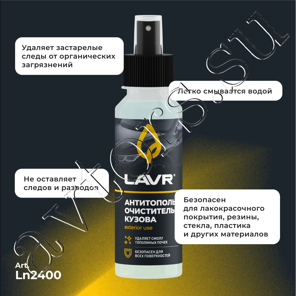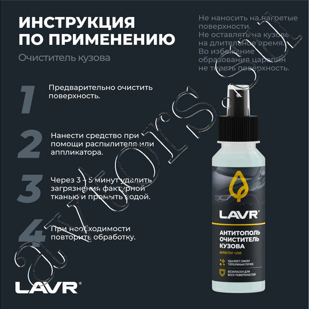 Средство для очистки поверхностей автомобиля от следов тополиных почек и других органических загрязнений. Удаляет застарелые следы от тополиных почек, древесных смол, птичьего помета и других органических загрязнений Легко смывается водой, не оставляет следов и разводов Безопасен для лакокрасочного покрытия, резины, стекла, пластика и других материалов